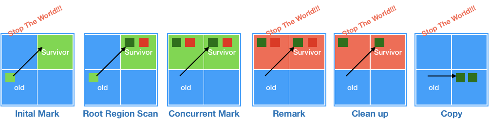 - Initial Mark : Old Region에 존재하는 객체들이 참조하는 Survivor Region을 찾는다(STW)