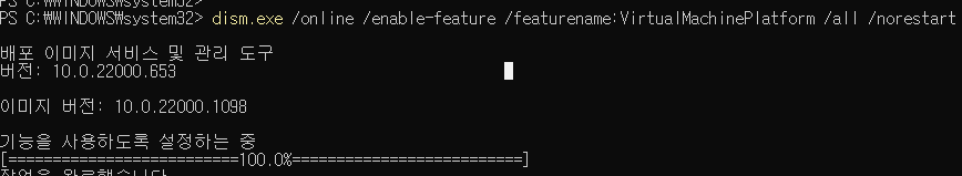 dism.exe /online /enable-feature /featurename:VirtualMachinePlatform /all /norestart